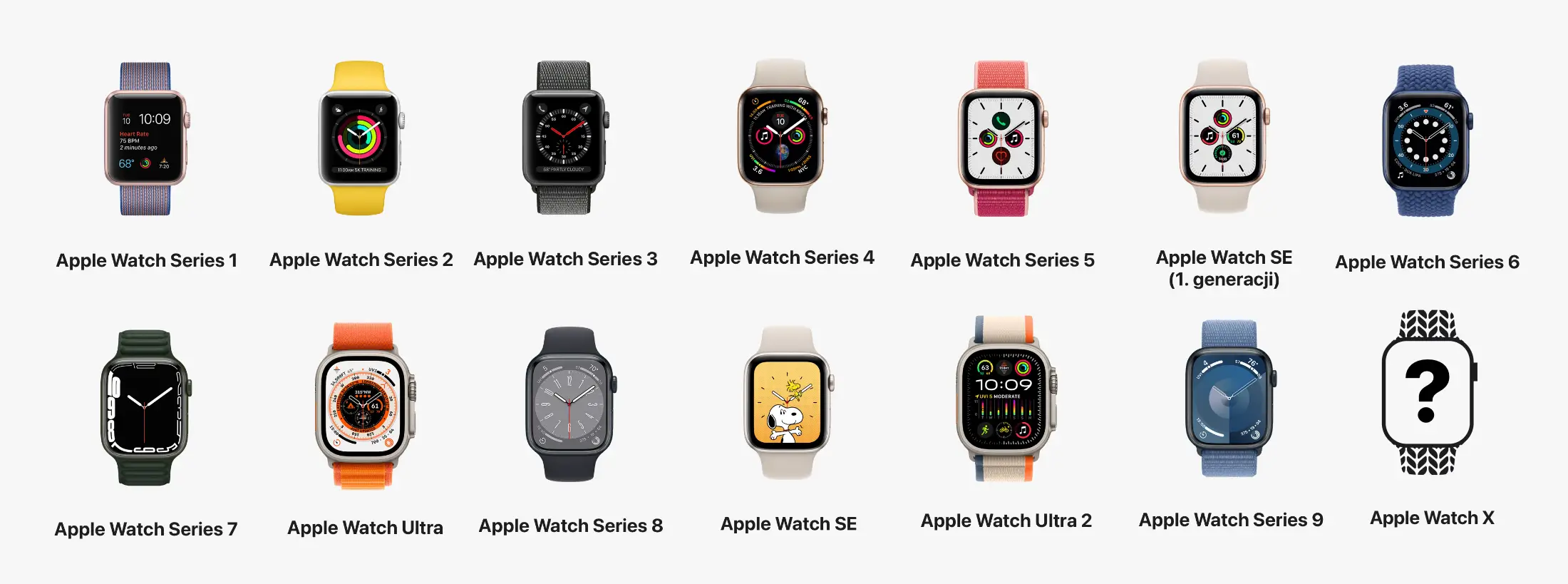 | Apple Watch Series 7 | 2021 | Większy ekran, szybsze ładowanie, bardziej wytrzymała konstrukcja. | |