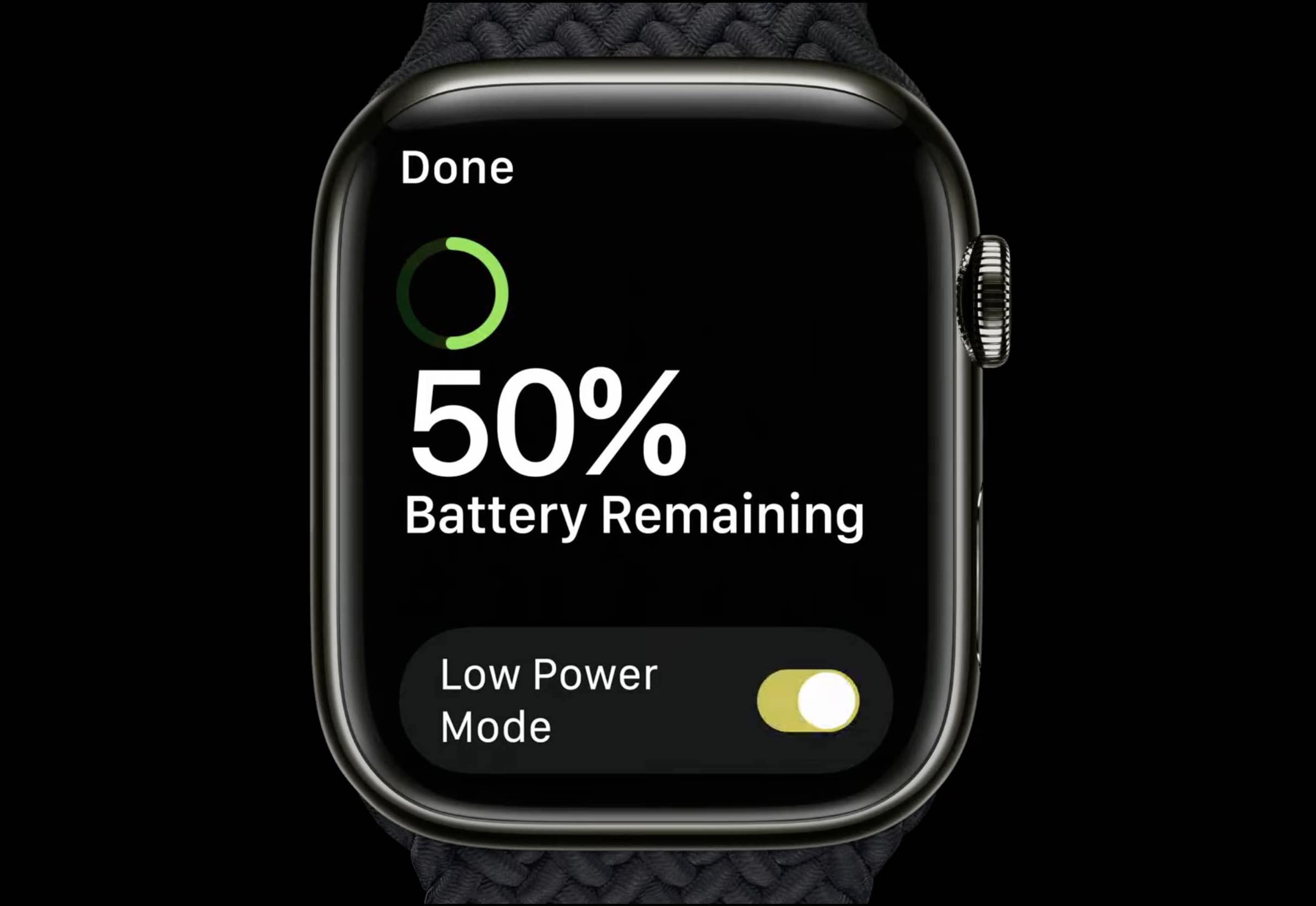 Aby włączyć tryb Power Reserve, naciśnij i przytrzymaj boczny przycisk, aż pojawią się suwaki, a następnie przesuń palcem po suwaku „Power Reserve”. Można go również aktywować z poziomu Centrum sterowania — stuknij ikonę procentu baterii, a następnie wybierz „Power Reserve” i potwierdź, naciskając „Proceed”. Po aktywowaniu ekran przybierze prosty, zielony wygląd, pokazując tylko aktualną godzinę.